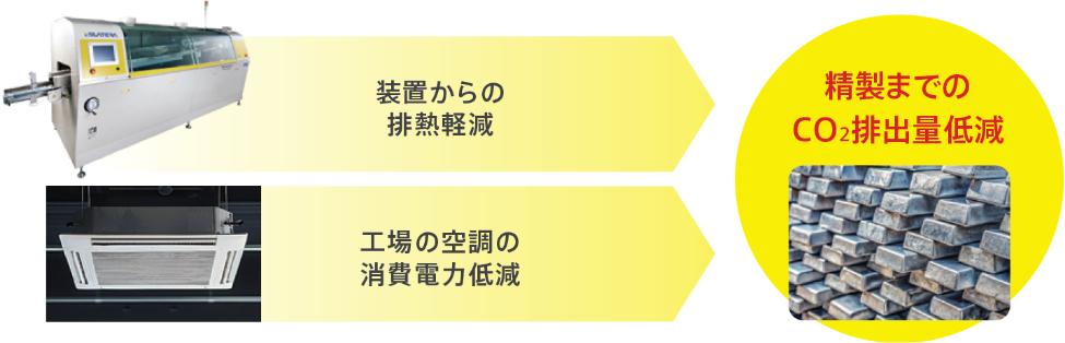 実装温度の低下により装置からの排熱が減少し、工場の空調負荷が軽減され消費電力の削減が可能です。また、Biははんだに使用される他の金属元素(Sn、Ag等)より精錬までのCO2排出量が抑えられます。