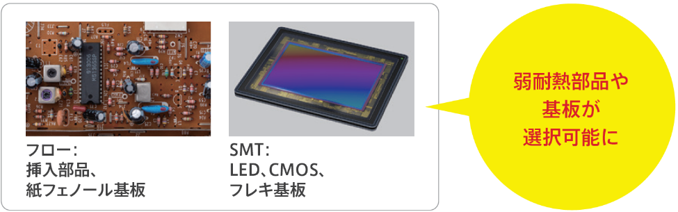 従来より耐熱温度の低い電子・電気部品・基板の選定が可能となり、部品・基板選定の自由度が高まることでコストを抑えた設計に寄与します。
