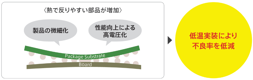 微細・薄型化が進む高機能な半導体パッケージにおいて、加熱時の反りによる不良対策が可能です。実装温度を下げることで反りを低減し、実装品質の向上に貢献します。